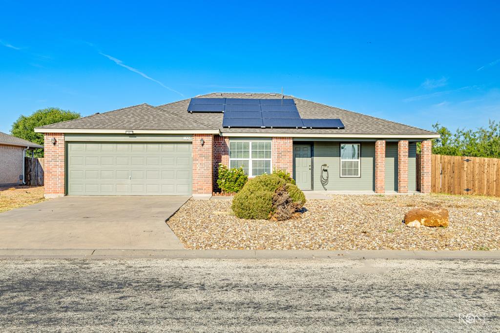 Welcome to this nice 3-bedroom, 2-bath home situated on a desirable corner lot! Featuring a spacious open-concept living area and split-bedroom floor plan, this home offers both functionality and privacy for modern living. Enjoy cooking and entertaining the kitchen, complete with stainless steel appliances, a farmhouse sink, and a quaint dining area perfect for cozy meal or hosting guests. Step outside to a zeriscaped front yard for low maintenance curb appeal and a covered front porch ideal for relaxing. The covered back patio is perfect for outdoor gatherings, and the privacy fence adds security and seclusion. Additional features include vinyl flooring throughout main areas, extra storage space, and solar panels paid off at closing for enhanced energy efficiency and reduced utility costs. Don't miss the opportunity to own this energy-efficient, move-in-ready gem that blends comfort, style, and practicality. Call your favorite realtor to schedule a showing. More pictures coming!